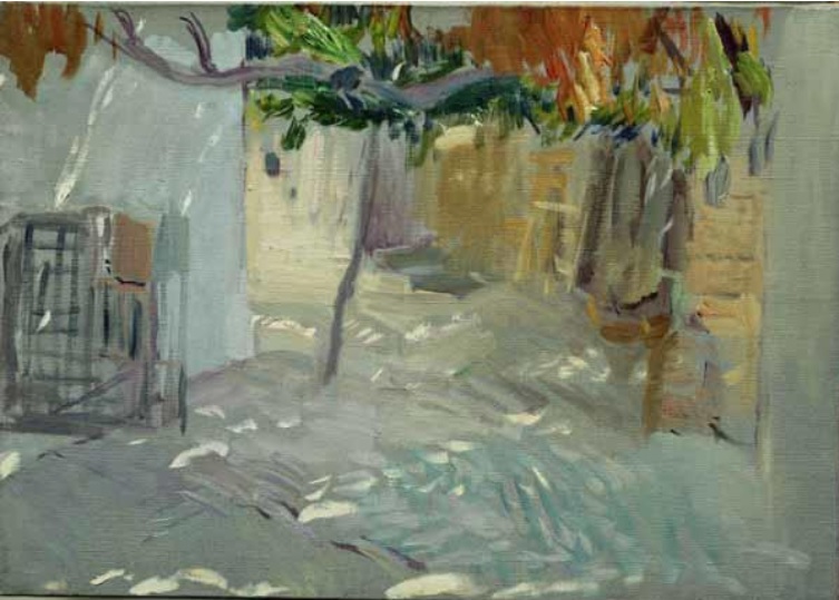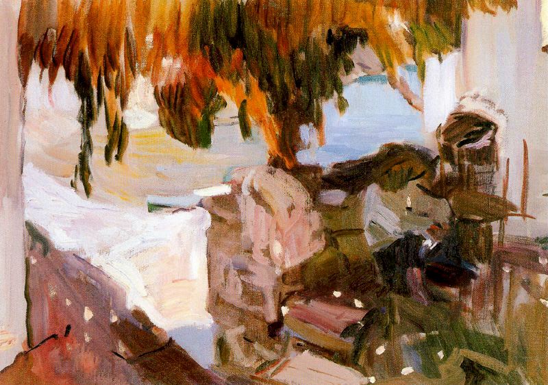 Si en la primera entrada de la serie conocíamos la Granada más patrimonial, en esta podemos ver los maravillosos paisajes de Sierra Nevada. También algunos rincones del Alcázar de Sevilla, un escenario del que Sorolla se sacó un buen número de obras. Siguiendo las fuentes del Museo Sorolla de Madrid, el pintor se desplazó a la capital andaluza en 1908 para retratar a la reina Victoria Eugenia, pero quedó tan prendado de los jardines del Alcázar, que se convertirían en punto de arranque de una nueva pintura dentro de la carrera del autor, la pintura de jardines. Esta fuente también señala que los jardines del palacio sevillano le sirvieron de inspiración a la hora de diseñar los exteriores de su palacete madrileño.