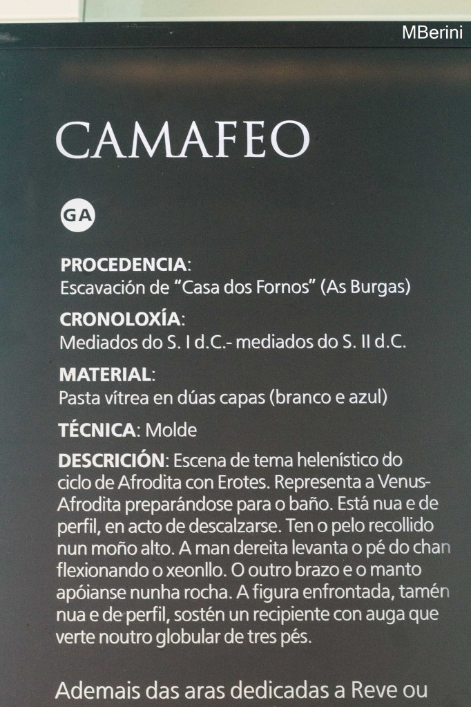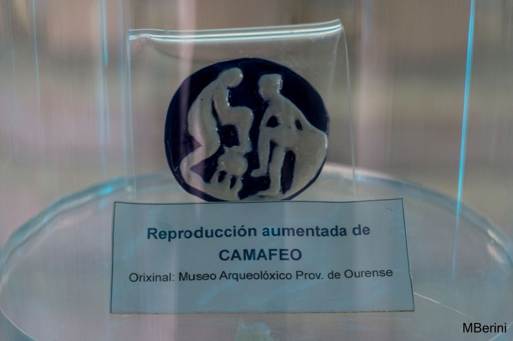 Como decía, en la primera sala se nos explica con claridad como la existencia de estas aguas termales se atribuyeron a una divinidad indígena, llamada Revve Anabaraego. Prueba de ellos son las aras votivas que se han encontrado en las inmediaciones del centro, dedicadas a esta figura divina. Las que podemos observar en la sala son reproducciones de las originales, depositadas en el Museo Arqueológico de Ourense. También se muestra una reproducción del famoso y curiosísimo camafeo de pasta vítrea que representa el baño de la diosa Afrodita. Es interesante detenerse también en el panel de esta sale donde, a través de un mapa, nos detalla otros puntos interesantes de la historia del termalismo en la provincia de Ourense.
