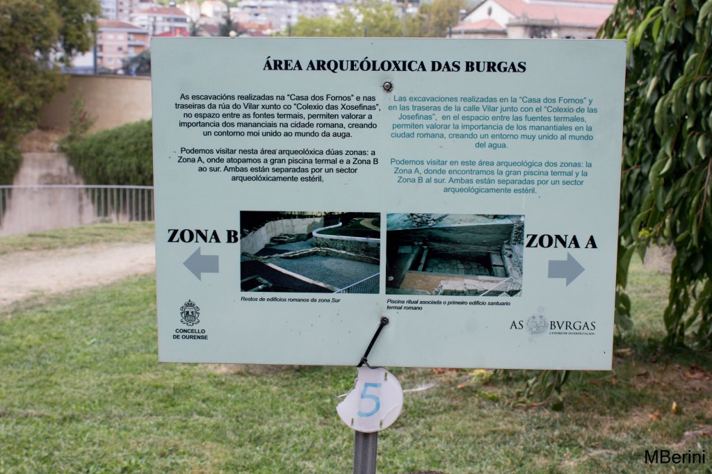 Si salimos del edificio por la puerta trasera, estaremos ya dentro de la zona arqueológica del complejo de As Burgas (abierto al público en un horario mucho más amplio y con otros acceso independientes si no queremos empezar el recorrido en el Centro de Interpretación). El yacimiento se divide en dos zonas: la zona A y la zona B.