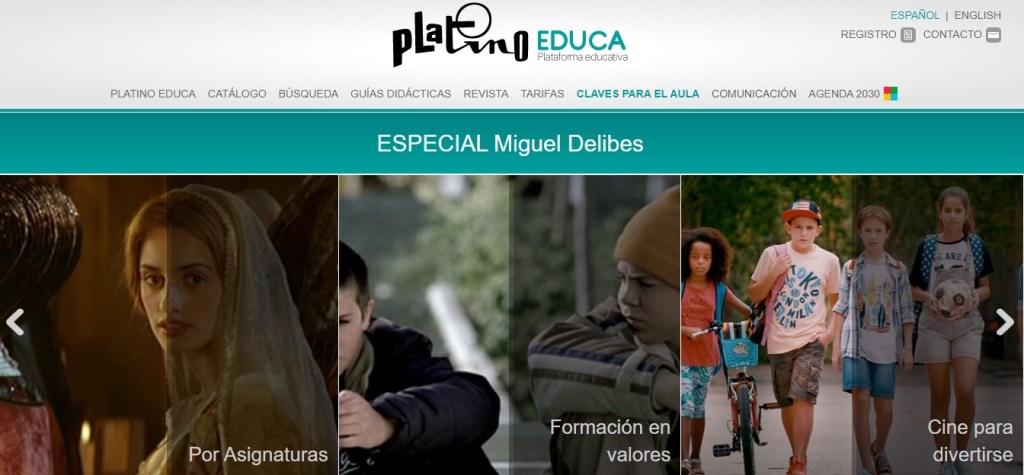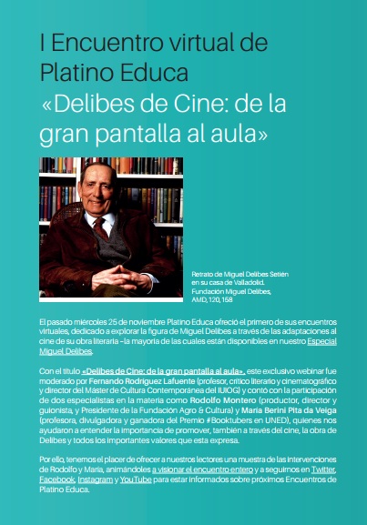 El webinar «Delibes de cine» se organizó como actividad complementaria del especial Miguel Delibes, el cual Platino Educa organizó con motivo del centenario del nacimiento del escritor vallisoletano. En su página web se abrió un apartado diferenciado donde se encuentran para su visionado algunas de las películas más destacadas que el cine español rodó basándose en las novelas de Delibes. Verdaderos clásicos de nuestro cine como la famosa cinta «Los santos inocentes» de Mario Camus, que trasladó la novela homónima del escritor castellano a la gran pantalla. Todas las películas, como señalaba antes, están acompañadas de materiales didácticos. El apartado especial podéis consultarlo siguiendo este enlace (click).
