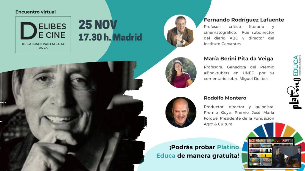 El pasado miércoles 25 de noviembre, a las 17:30 hora española, se celebró el encuentro virtual «Delibes de cine: de la gran pantalla al aula», en el que tuve el placer de participar como ponente, de la mano del proyecto Platino Educa.