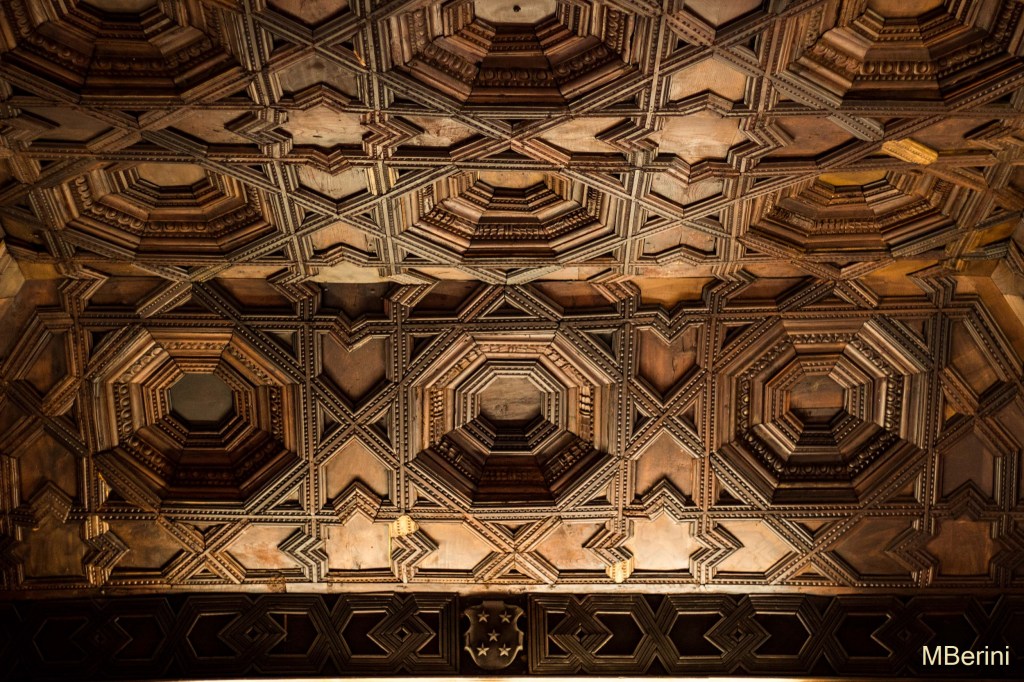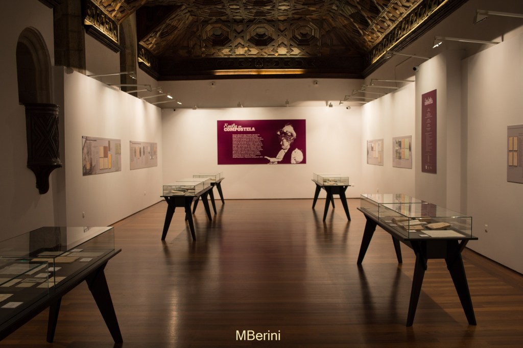 En la sala del artesanado, que recibe dicho nombre por el increíble artesonado mudéjar que corona la estancia, la exposición recorre, en orden cronológico, la vida de la condesa en lo relativo a su relación con Compostela, de ahí que esta primera parte se titule «Emilia en Compostela (1866-1879)». Recuerdos de su juventud –con tan sólo 15 años le escribió bellos poemas a la ciudad–, de su etapa de recién casada –cuando su marido era estudiante de Derecho en la Universidad de Santiago–, pasando por sus constantes colaboraciones en los círculos culturales e intelectuales de la ciudad jacobea –desde muy temprana edad, cuando compartía los ideales carlistas/tradicionalistas–. A pesar de que dedicarse profesionalmente a las letras le llevó a pasar largas temporadas fuera de Galicia –en Madrid fijó su residencia, pero también viajando por Europa–, Santiago de Compostela nunca dejó de estar presente en su vida, tal y como podemos comprobar en esta primera sala de la exposición.