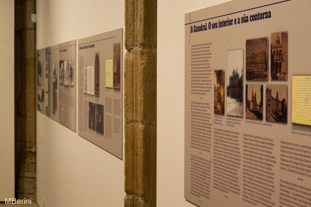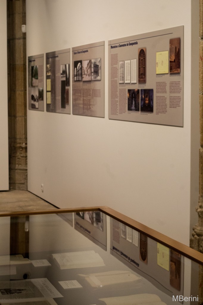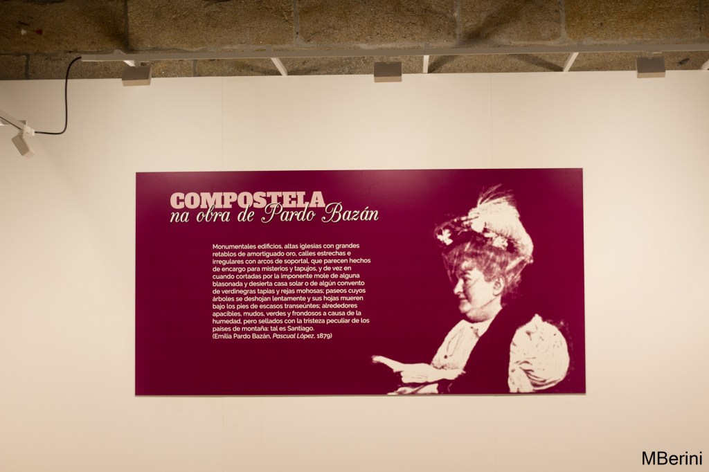 En la antigua capilla del Colegio Fonseca se sitúa el segundo capítulo de la exposición «Dona Emilia e Compostela», titulada «Compostela na obra de Pardo Bazán (1880-1921)». En esta sala la muestra se centra exclusivamente en la obra artística de la condesa, por lo que todo el material expuesto, así como los paneles explicativos, hacen referencia a las novelas, ensayos, artículos periodísticos, y otros escritos, firmados por doña Emilia, en los que Santiago de Compostela es la protagonista. No sólo encontramos referencias a la ciudad del Apóstol en novelas como «Los Pazos de Ulloa» –quien no recuerda la estancia del marqués de Ulloa con sus parientes santiagueses– o «Pascual López» –ambientada en Santiago, su protagonista es un estudiante de medicina–, sino también interesantes artículos que Pardo Bazán publicó en diferentes medios, a cuento, por ejemplo, del Año Santo o del Camino de Santiago. En todos estos escritos, la escritora coruñesa da muestra del profundo conocimiento que tenía de la ciudad, dejándonos brillantes descripciones de la misma.