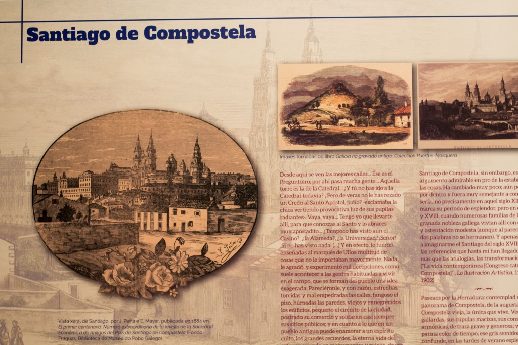 «Monumentales edificios, altas iglesias con retablos de amortiguado oro, calles estrechas e irregulares con arcos de soportal, que parecen hechos de encargo para misterios y tapujos, y de vez en cuando cortadas por la imponente mole de alguna blasonada y desierta casa solar o de algún convento de verdinegras tapias y rejas mohosas; paseos cuyos árboles se deshojan lentamente y sus hojas mueren bajo los pies de escasos transeúntes; alrededores apacibles, mudos, verdes y frondosos a causa de la humedad, pero sellados con la tristeza peculiar de los países de montaña: tal es Santiago»