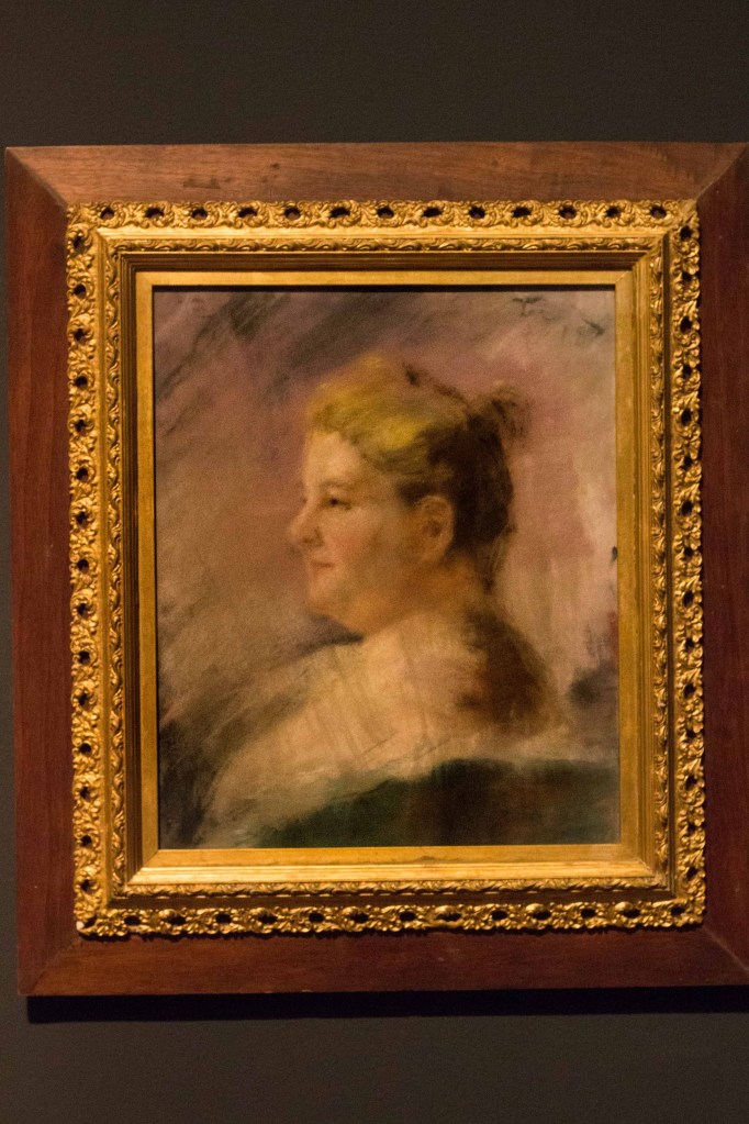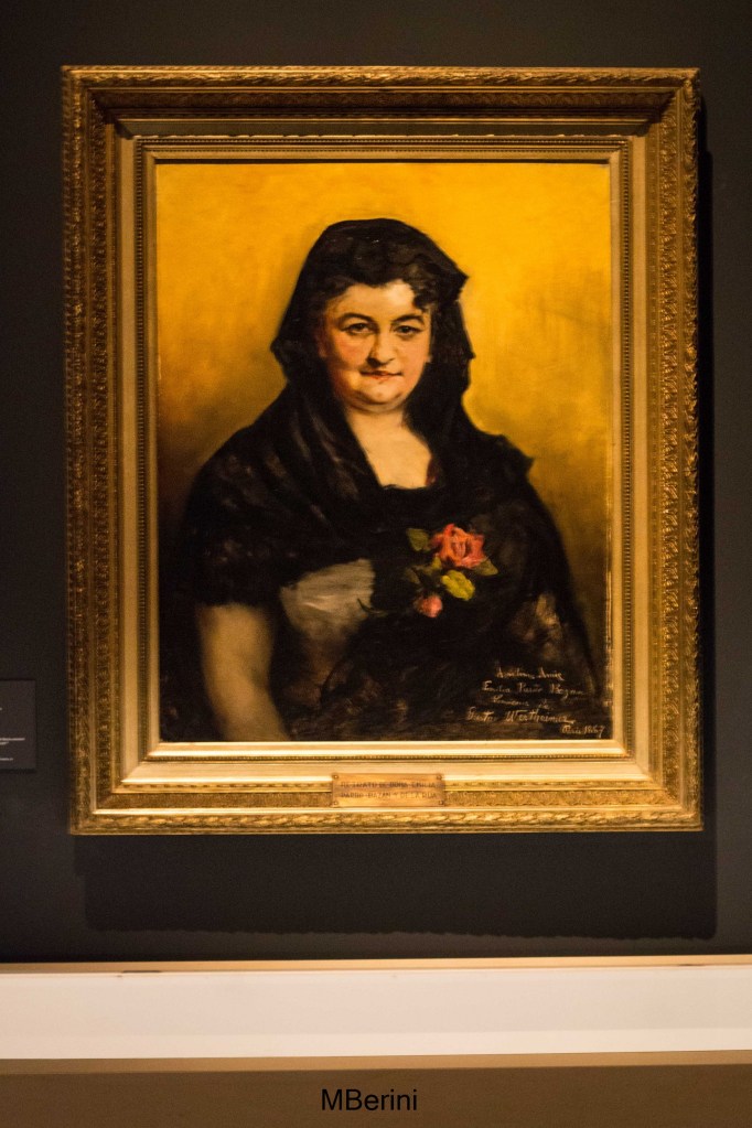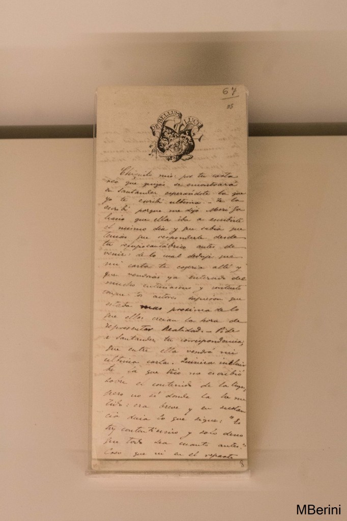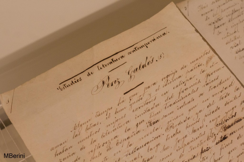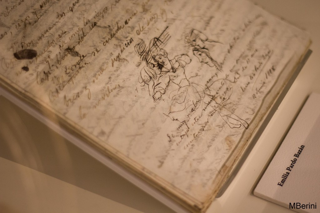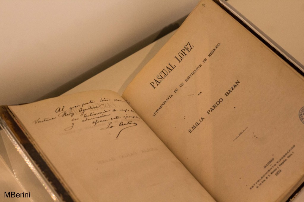La exposición, titulada «Emilia Pardo Bazán. El reto de la modernidad» está comisariada por la catedrática Isabel Burdiel –autora de una excelente biografía sobre la escritora, editada por Taurus; una maravilla que leí el año pasado y cuya lectura recuerdo como una experiencia maravillosa de aprendizaje y disfrute–. No resulta nada fácil resumir la vida de un personaje tan activo y prolífico como doña Emilia, pero creo que realmente han conseguido que recorrer la exposición sea acercarse a la vida y la obra de esta autora, tocando todos los puntos sensibles de las mismas. No sólo el hilo conductor y la síntesis de la muestra es excelente, sino que la selección de todas las piezas que forman parte de ella es igualmente acertada. Nunca había visto reunidos en un mismo espacio expositivo los manuscritos, primeras ediciones, cuadros, objetos personales, referencias de prensa o fotografías que configuran de manera tan significativa el perfil biográfico de Pardo Bazán. Muchos de ellos han sido aportados por la Real Academia Galega y la Casa-Museo de Emilia Pardo Bazán en A Coruña.