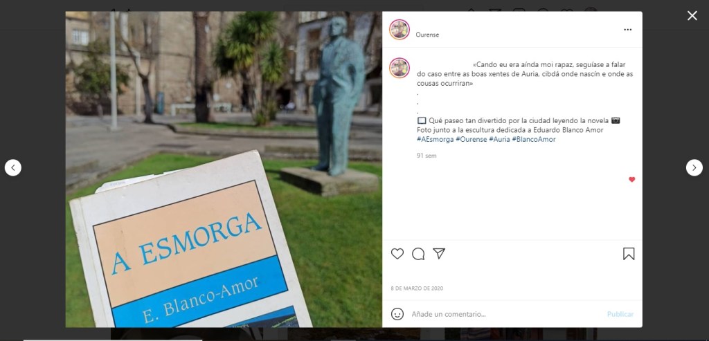 Poucos días antes de estoupar a crise sanitaria do coronavirus, en marzo do ano 2020, viaxei ata Ourense co fin de desfrutar dun plan moi especial: ler a famosa novela do escritor galego Eduardo Blanco Amor, «A Esmorga», paseando polas rúas da cidade onde está ambientada, Ourense –Auria, nome literario desta na obra–. Despois de moitos anos de viaxes a excursións singulares baseados en novelas ou episodios moi concretos da Historia, resúltame difícil escoller entre tantos recordos. Sen embargo, aquela excursión literaria a Ourense, un marabilloso día de sol en primavera, é unha das mellores lembranzas viaxeiras que teño dos últimos tempos. Sen dúbida, paga a pena adicar o tempo ás cousas que nos fan felices!