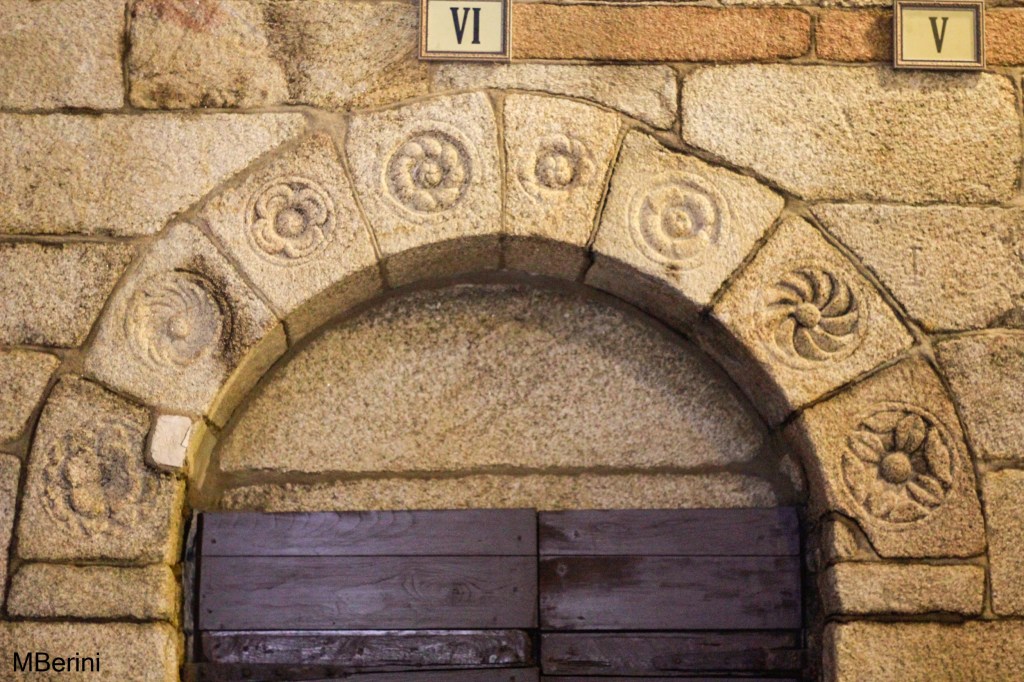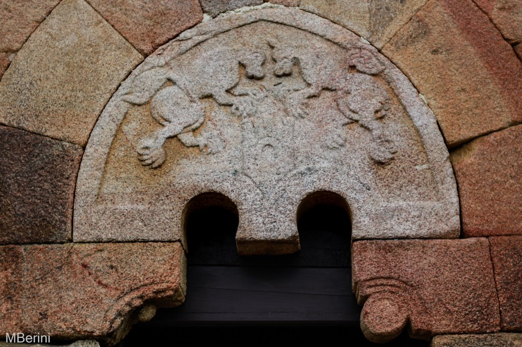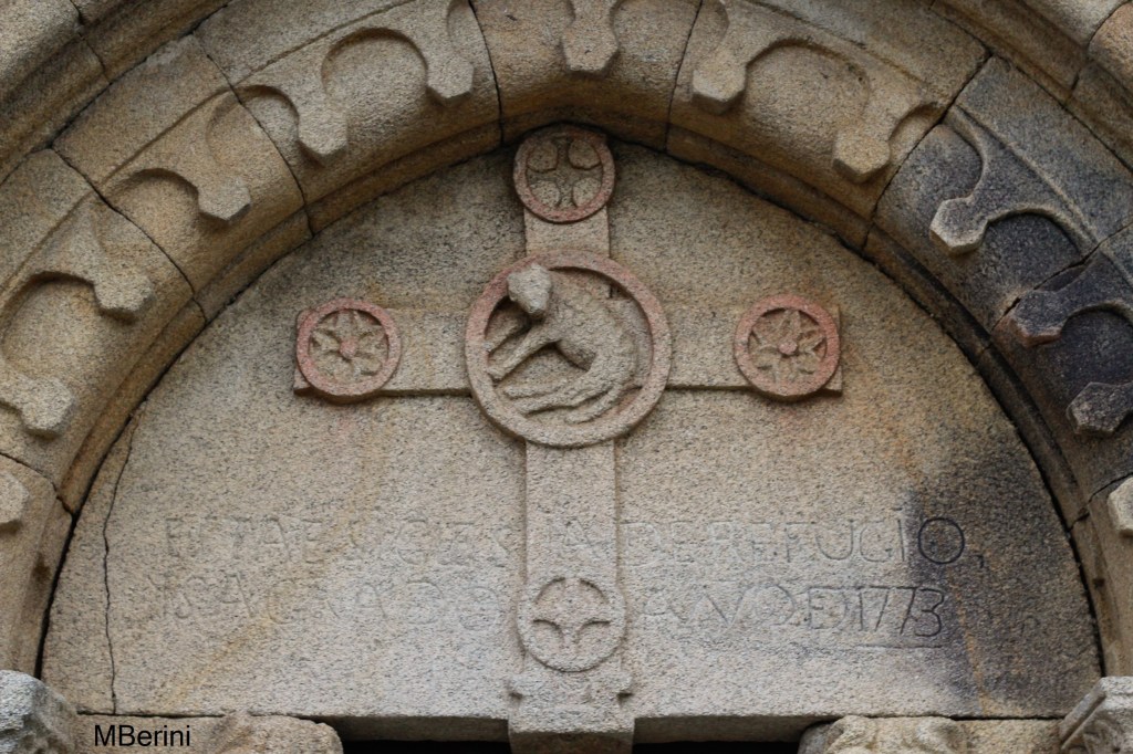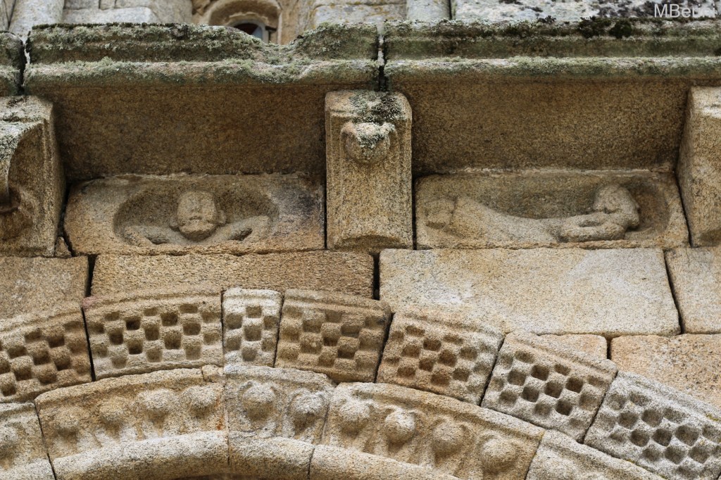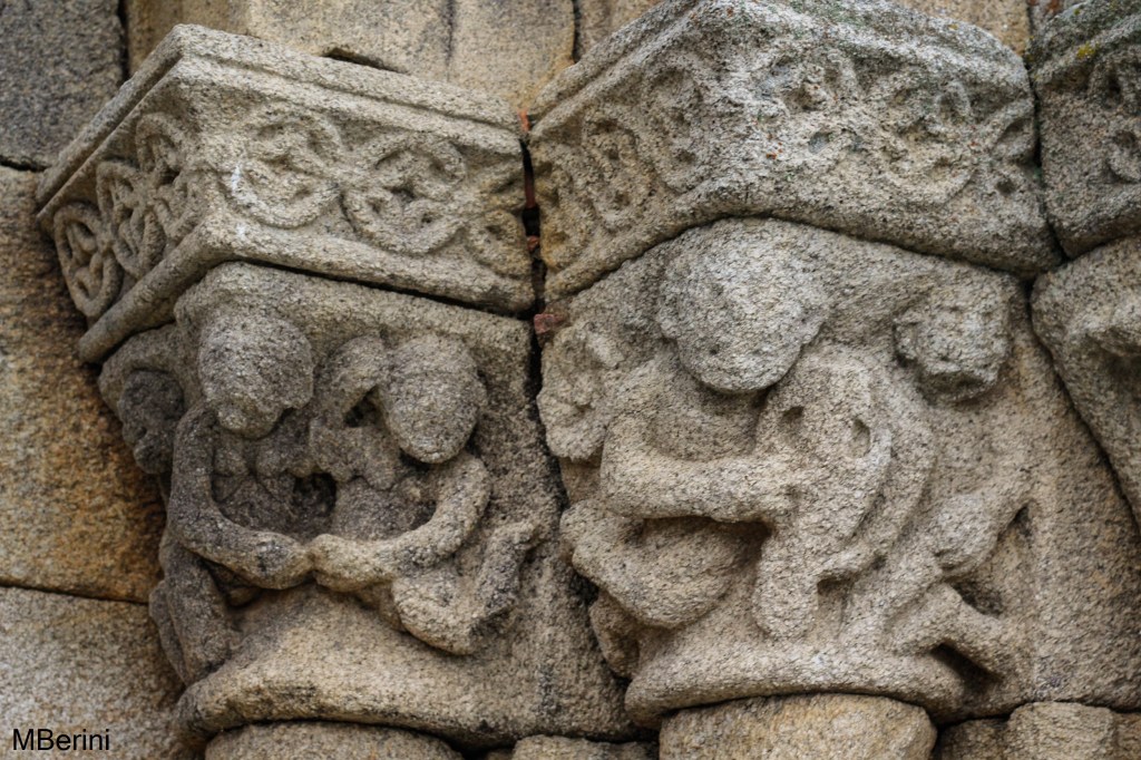Menciono aparte los capiteles, quizá los elementos más deteriorados de todo el conjunto. Lado norte (de interior a exterior): entrelazos vegetales, un animal mordiendo a otro y hojas con fintas remetadas en volutas. Lado sur: figuras que representan una escena de juglaría en los dos interiores, y hojas con sogueados rematados en volutas en el exterior. En las mochetas de la puerta nos encontramos con dos fieras con la cabeza girada al exterior y, en el tímpano, una cruz de influencia bizantina, dentro de la cual podemos observar un Cordero inscrito en un círculo. La inscripción del siglo XVIII hace referencia al templo como refugio de amparo sagrado. Pero aquí no acaba la singularidad de esta fachada. Aún vamos a encontrar más decoración a raíz del tejaroz que presenta. Éste sustenta seis canecillos, entre los cuales se introducen tabicas también decoradas –un lobo, una serpiente, varios hombres…–.