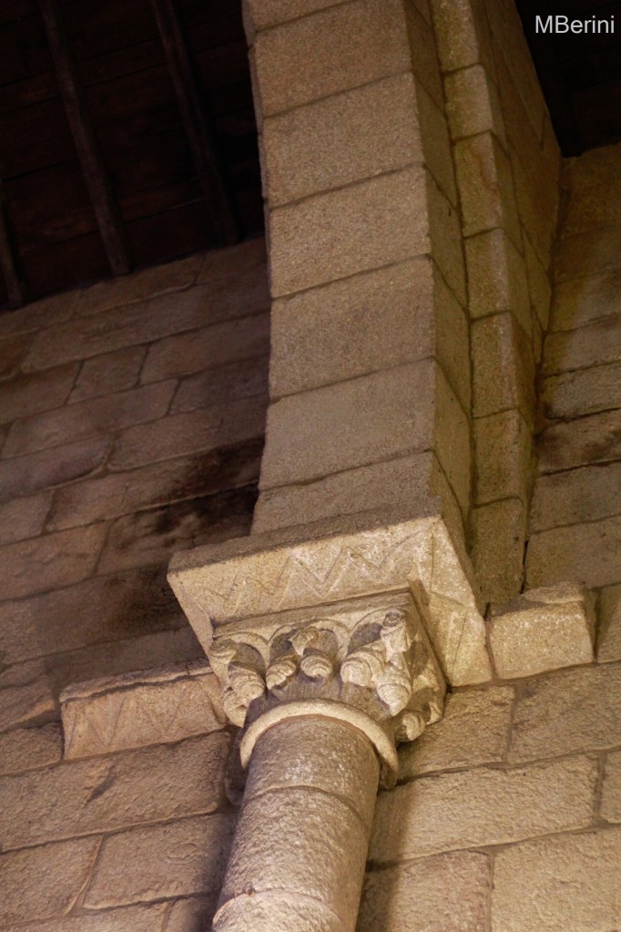 Los muros laterales –construidos con distintos tipos de granito, de ahí la diferencia cromática– están reforzados con unos grandes contrafuertes, que los dividen en tres tramos, y en ellos se sitúan algunos de los vanos que iluminan la iglesia. De los ocho con los que cuenta el templo, tres se sitúan en el muro septentrional –muy austeros– y dos en el meriodional –más complejos, con arquivolta y columnillas, entre otros elementos–. Los contrafuertes vienen a reforzar los arcos fajones que sostienen la cubierta, de madera a dos aguas. Como ya he comentado antes, la iglesia de San Pedro da Mezquita destaca por la variedad de su decoración e iconografía, y un primer ejemplo de ello lo encontramos ya en los muros, gracias a las cobijas y a los canecillos, y a las arquivoltas, los capiteles y el cimacio en los vanos que cuentan con ellos, los del muro sur. Los motivos decorativos más repetidos son de tipo vegetal y geométrico.