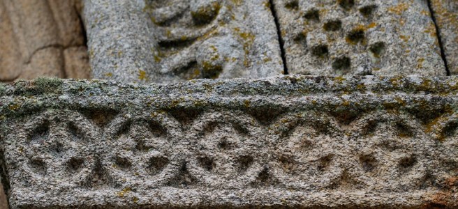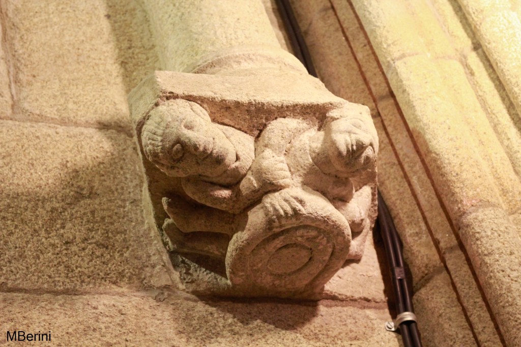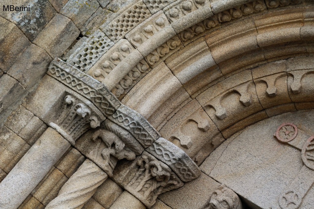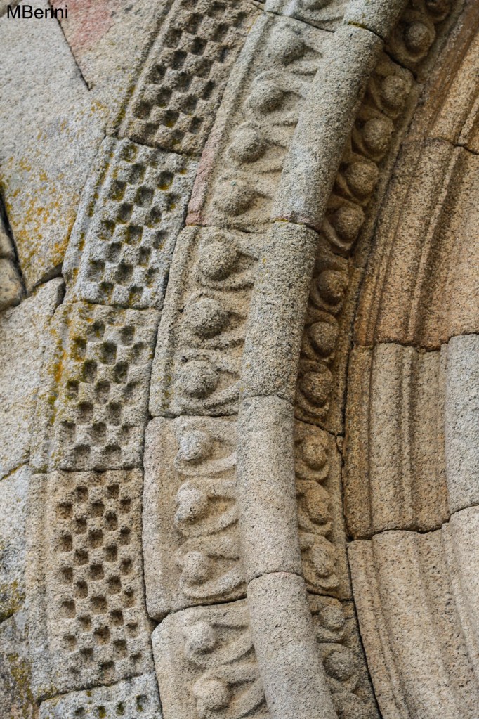 Pero lo más interesante del templo a nivel exterior es la fachada principal, la occidental. Me centraré en la decoración y la iconografía por su singularidad. La triple arquivolta del arco y la chambrana presenta una ornamentación variadísima con arquillos, bocel, medias cañas, baquetillas, hojas, bolas, ajedrezado… También llaman la atención los motivos geométricos de los cimacios –diferentes en cada lado– y que de las tres columnas, la central es entorchada.