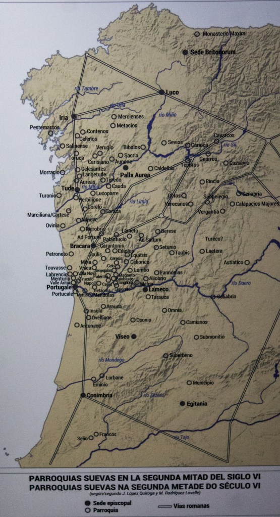 A comienzos del siglo V, la Península Ibérica, cuyo territorio formaba parte del gran Imperio Romano, es invadida por pueblos originarios del norte de Europa, consecuencia de unos importantes movimientos migratorios que nosotros bautizamos como «invasiones bárbaras». En el norte de Portugal y la actual Galicia se instalan los suevos, creadores de una de las primeras monarquías medievales, entre los años 411 y 585 aproximadamente. Los suevos se encuentran con una sociedad fuertemente romanizada, y la falta de aportaciones intelectuales propias les hace asimilar la cultura latina. A pesar de ello, al reino suevo debemos la profunda cristianización del territorio. Es durante este tiempo en el que se levantan las primeras catedrales en la península –San Martiño de Mondoñedo–, consecuencia de la organización eclesial en diócesis –Braga–. A colación de este asunto debemos citar a personajes tan relevantes como San Martiño de Dumio, obispo, teólogo y literato, impulsor de los Concilios de Braga, claves en la regularización del cristianismo. El reino suevo desaparecerá a finales del siglo VI, al ser conquistado por los visigodos, consecuencia de la ambiciosa campaña expansiva del rey Leovigildo.