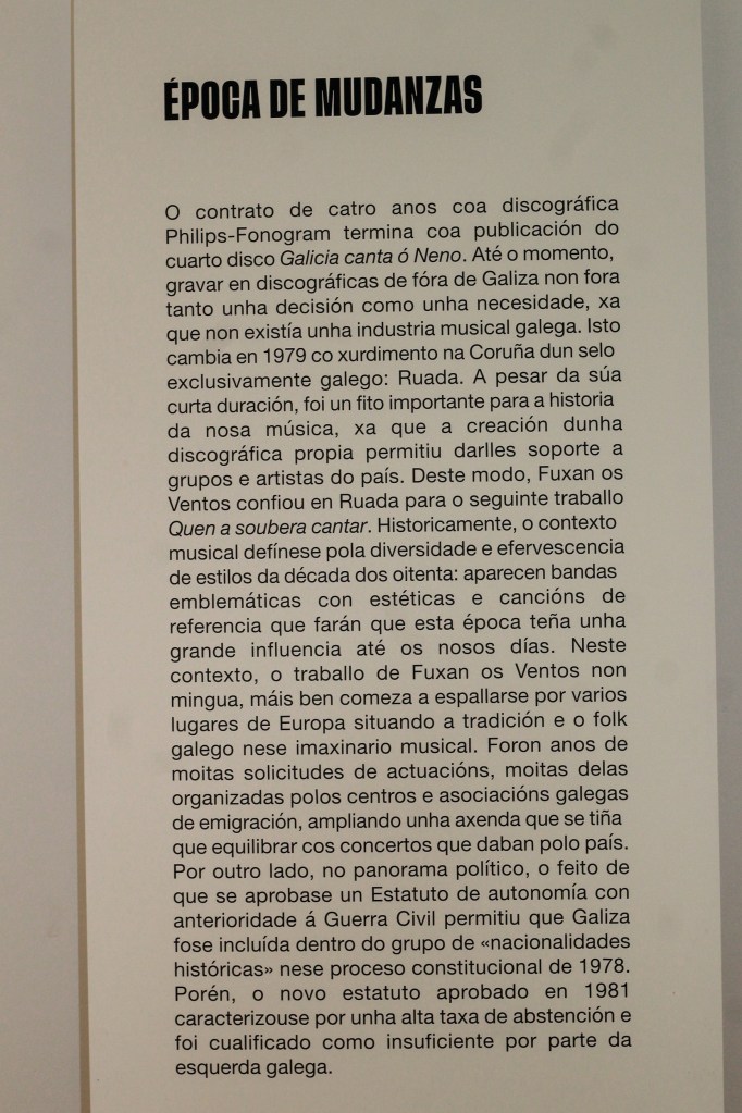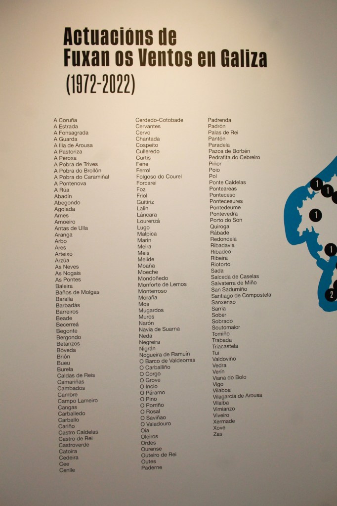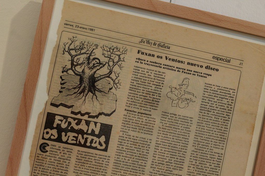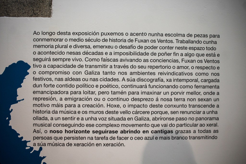 Se algo bo ten a chegada do outono —ademais do pracer de comer setas ou castañas e dar paseos polo monte— é que nel comezan a se desenvolver as axendas culturais das diferentes cidades e vilas. Hai poucas semanas publicaba nesta páxina as dez mellores exposicións da tempada en Madrid. Mais, por sorte, na nosa terra a oferta tamén está a ser ben interesante: mentres deixamos atrás as fotografías de Ruth Matilda Anderson no Museo de Pontevedra e comezamos a pensar no centenario Picasso no Museo de Belas Artes da Coruña, Lugo acolle unha exposición conmemorativa dos 50 anos de Fuxan os Ventos. No espazo cultural O Vello Cárcere podemos visitar ata o mes de xaneiro esta mostra retrospectiva da carreira musical da banda lucense. Como veremos logo, se ben singular é o espazo que a custodia, tanto ou máis é a variedade de elementos coa que debuxa a traxectoria do grupo: carteis, fotografías ou partituras, mais tamén instrumentos, poemas e gravacións inéditas. O título oficial da exposición, «Fuxan os Ventos: 50 anos de historia», fala ás claras.