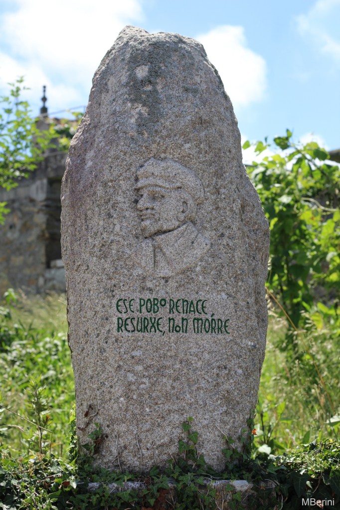 «Se non for na Ponte-ceso / sepultádeme na Cruña, / nesta garrida cibdade / que mil belezas aduna, / a cabo do insigne Curros, / xa que a d’el y-a miña musa / a fala de Breogán / fixeron nobre e robusta: / Eu quero xacer de par / de tan nobre sepultura…»