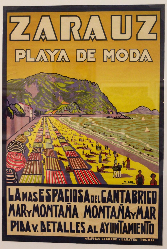 Siguiendo el itinerario lógico del museo, la primera exposición temporal con la que nos toparemos será «Clima ideal». Esta muestra toma su nombre de un lema publicitario de 1934, que reclamaba la ciudad de San Sebastián como destino turístico de acuerdo a la bonanza de su clima. Y es que precisamente la exposición gira en torno a eso, a la publicidad, y más en concreto al diseño turístico, puesto que Donostia, desde finales del siglo XIX hasta aproximadamente 1970, se erigió como una ciudad turística de primer orden, competidora de otras tan famosas como la francesa Biarritz. También la provincia de Guipúzcoa fue objeto de promoción turística, en razón a sus playas, a sus tradiciones y a todos los eventos que en ella se organizaban, tanto deportivos como musicales, por citar dos ejemplos. En «Clima ideal» encontraremos carteles y folletos turísticos de época y resulta muy interesante ver la evolución artística de los diseños, reflejo de las distintas etapas históricas. Y es que las campañas de promoción turística fomentaron el talento y la creatividad de numerosos artistas, ya que el diseño de los materiales se sacaba a concurso. En definitiva, gracias a esta exposición temporal podemos realizar un interesantísimo viaje en el tiempo con las miras puestas en el turismo y el diseño gráfico. «Clima ideal» se podrá visitar hasta el 15 de octubre, de martes a domingo en horario de 10:00 a 20:00 horas.