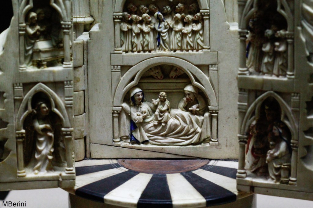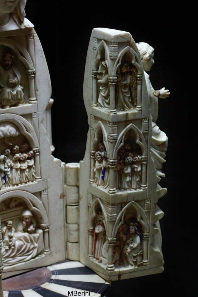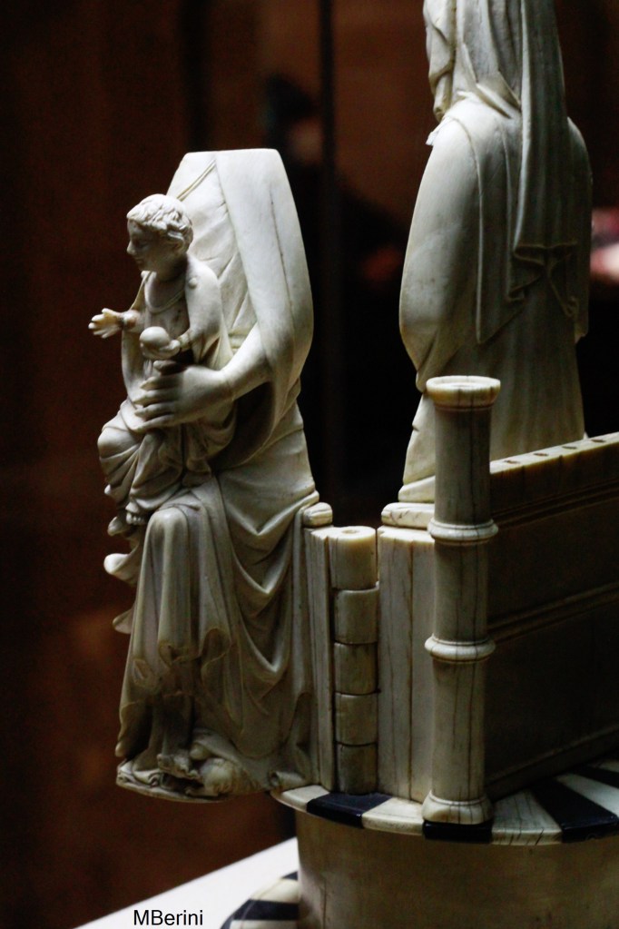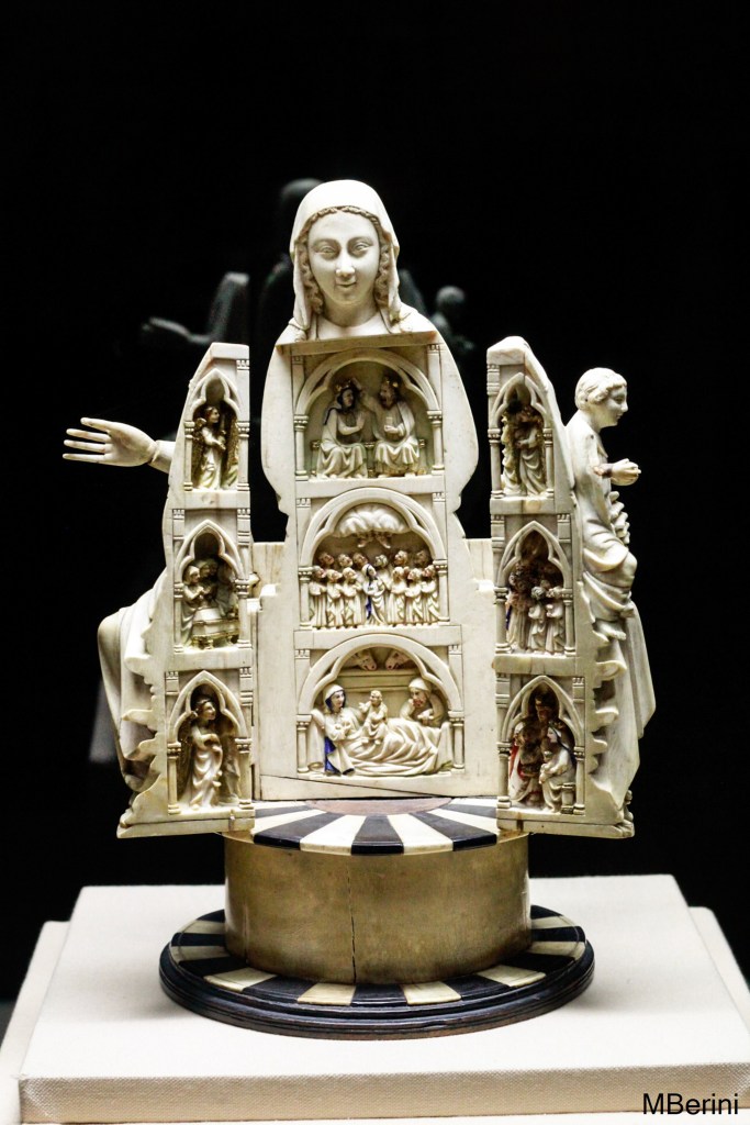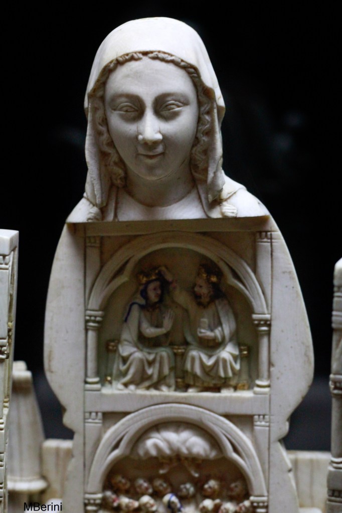 En cualquier caso, estamos ante una figura de 251 mm de altura sin peana, hecha en marfil y que presenta restos de policromía. La peana suma 63 mm y está hecha de marfil y ébano. Cerrada presenta a una Virgen sedente sobre trono, vistiendo túnica y manto. La Virgen sonríe y luce un cabello ondulado con velo, aunque existen dudas sobre si llevaba corona o no. María sostiene al Niño, frontalmente dispuesto y sentado sobre su pierna, quien sujeta una bola y bendice ―todo ello responde al esquema típicamente medieval―. Con la pierna izquierda la Virgen somete a un animal, en alusión a María como vencedora del mal. En posición abierta, la figura se abre desde el cuello y forma una especie de tríptico con tres calles y tres cuerpos, representando los siete gozos de Nuestra Señora en las siguientes escenas ―de izquierda a derecha y de arriba a abajo―: Asunción y Coronación de María; Resurrección, Ascensión del Señor y Pentecostés; Anunciación, Nacimiento de Jesús y Adoración de los Reyes.