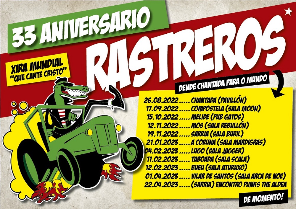 Os Rastreros.- The Ramones en NY, Sex Pistols en Londres, La Polla Records en el País Vasco… e Rastreros en Chantada. Chamábanlle agropunk antes de nacer o bravú e eran os organizadores do Castañazo Rock. Naturais das aldeas de Viana, Esmoriz e Camporramiro (Chantada, Lugo) catro rapaces, Xesús, Marcos, Xulio e Xoán, sen idea algunha de solfexo, coinciden na tasca Bar Miño e deciden montar unha banda de rock. Corre o ano 1989. Mercan instrumentos de segunda man, o máis baratos posible. Adoptan un nome que ven do que lles decía un xastre comunista da zona: «sodes uns rastreiros». O primeiro ensaio ten lugar nunha corte da aldea de Quintá e, como ben dixo un dos asistentes, as vacas non deron nin gota de leite. O seu primeiro concerto tivo lugar en Vigo, no ano 1991, para Radio Piratona. Gravan unha maqueta logo, «Non lle toque-lo rabo á vaca, que pensa que é boi». No ano 92 os veciños subvenciónanlles un EP de catro temas, «Perigo! Animais ceibes», nado nun estudo de Vigo. Gravarán outros catro temas máis grazas a acadar o segundo premio no Concurso Pop-Rock do Xacobeo 93. E o primeiro álbum chega en 1996, cun gaiteiro xa presente na banda, e levou o título de «Rastreros. A piñón fixo, a golpe de pixo». Máis tarde virán os discos do Xabarín, a colaboración con Dixebra nun disco colectivo a prol do asturianu e máis lumes nunha carreira musical intermitente que aínda resiste. Na edición deste 2023 do Castañazo volveron subir ao escenario. Punk rural e outras lerias para o mundo.