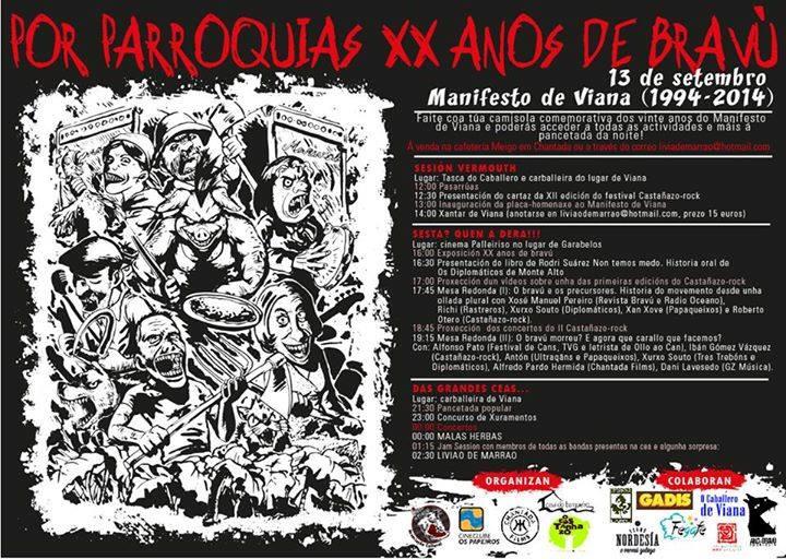 E así chegamos a data clave: o 31 de outubro do ano 1994, a nosa efeméride. Na taberna Caballero ―coñecida como do Sistema― de Viana, en Chantada, ten lugar unha gran xuntanza: Rastreros, Os Diplomáticos e un feixe de bandas como os Skornabois de Lourenzá, Impresentables de Vimianzo, O Caimán do Río Tea de Ponteareas ou Yellow Pixoliñas de Monforte, entre outras. Tamén acudiron periodistas como Alberto Casal ou escritores como Manolo Rivas. Comeron cocido e regaron a sobremesa con augardente e licorcafé. Xurdiu un debate e firmouse o chamado «MANIFESTO DE VIANA» cos principios que habían de definir o movemento. Ao día seguinte tivo lugar un concerto con seis bandas no cartel, entre elas Heredeiros da Crus ―fóra do movemento por vontade propia, mais dentro do mesmo por natureza―.