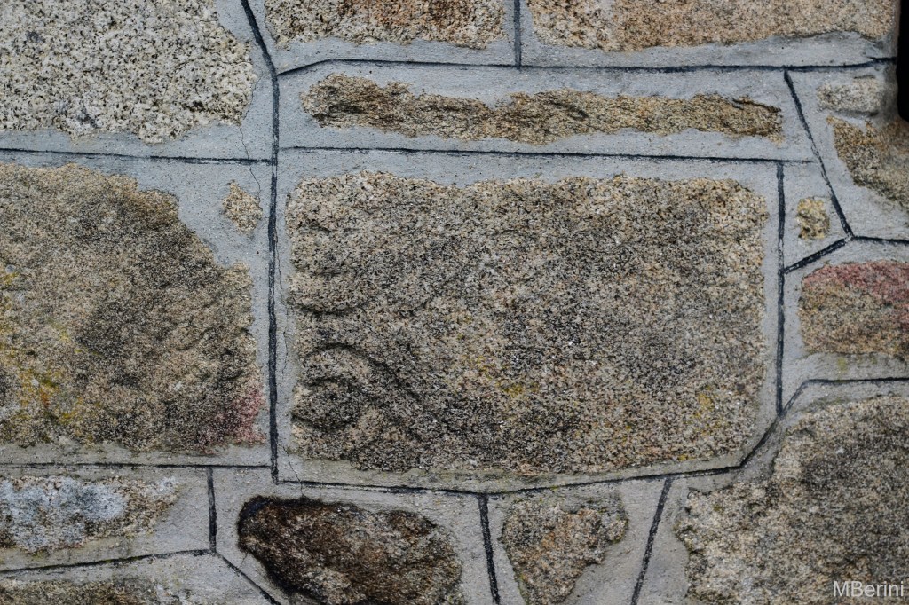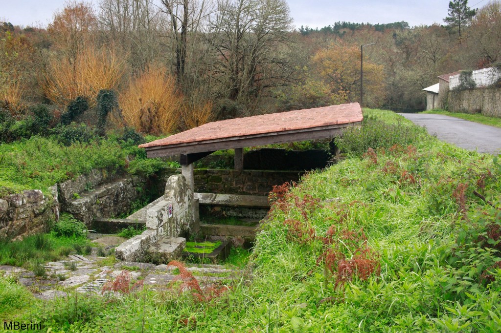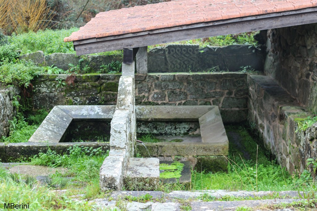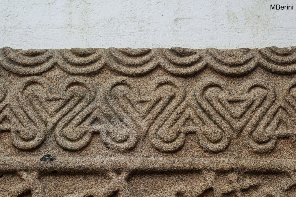 Volvemos a montarnos en el coche para desplazarnos apenas tres kilómetros hasta la parroquia de Fontefría. Allí, incrustado en los muros de un lavadero público, encontramos otro interesantísimo relieve de tema geométrico, combinando círculos y rombos. Las teorías principales apuntan a que también procedía de Monte Castelo.