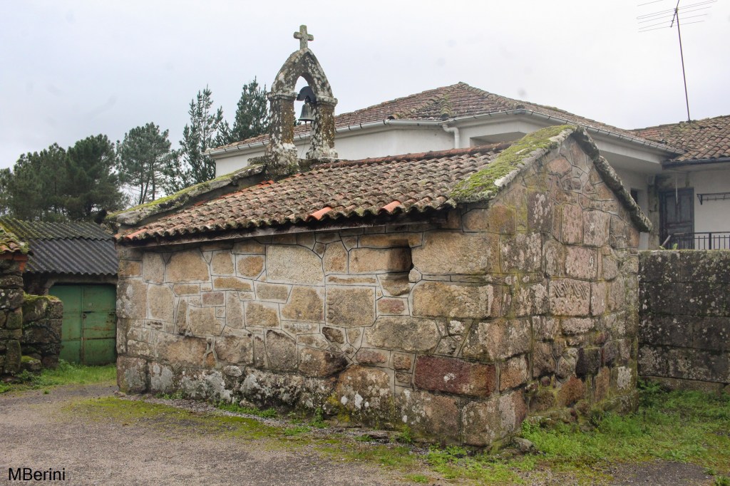 Por último, sin cambiar de parroquia nos desplazaremos un kilómetro y medio en coche hasta el lugar de Sanxiao. En la pequeña capilla de Sanxiago, mezclado entre sus sillares, encontramos algunos de origen castreño, labrados con un motivo de eses encadenadas. La duda es: ¿serían piedras procedentes de jambas o de un dintel?