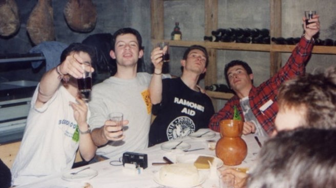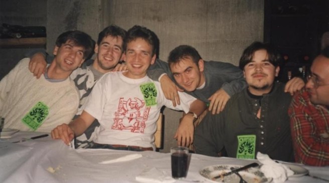 E así, chega, por fin, a xuntanza cos fundadores. Souto entra na vila coa banda sonora d’Os Rastreros para recordar aquel II Castañazo Rock no que se encontraran preto de unha ducia de bandas. Na porta do Caballero de Viana agarda Richi. Descargan do maleteiro os agasallos e entran no establecemento. Na miña butaca, agora, sinto unha emoción inmensa: vou ver como é por dentro aquela taberna tan especial. Antón dos Papaqueixos, Benxamín dos Impresentables de Vimianzo e Rafa d’O Caimán do Río Tea están listo para a celebración.
