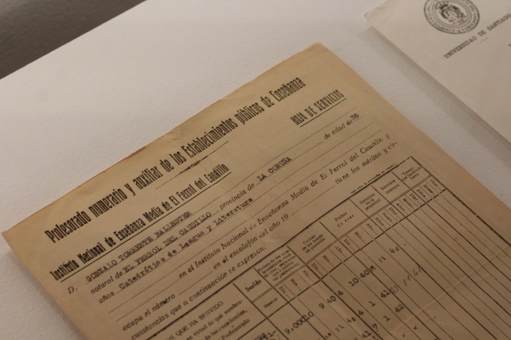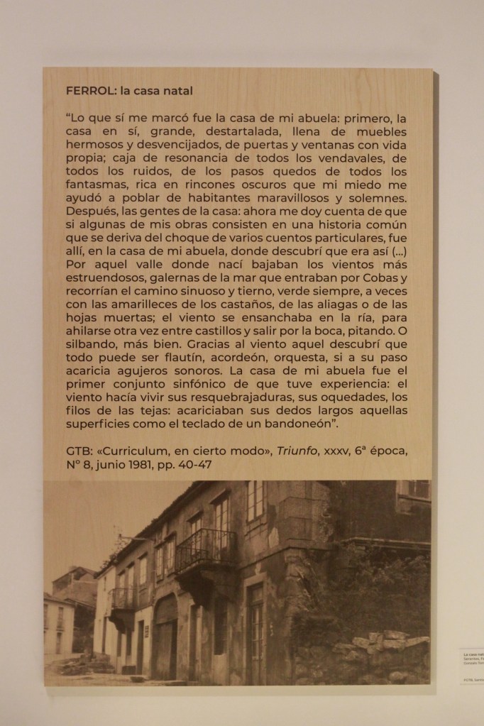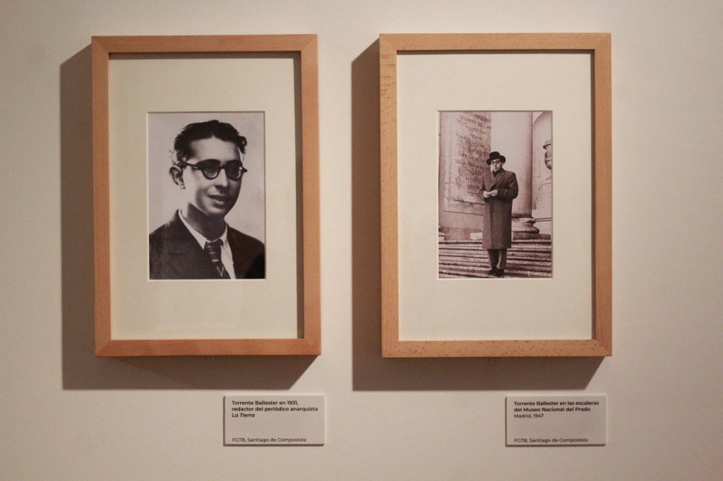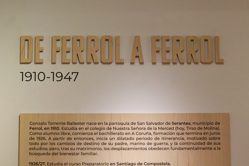 Gonzalo Torrente Ballester nació en la parroquia de Serantes (Ferrol, A Coruña) en el año 1910. Precisamente la primera parte de la exposición refleja estos primeros años de vida en la ciudad departamental. Torrente fue desde joven un erudito adolescente, en palabras de biógrafos, porque sus desordenadas lecturas adolescentes marcaron todo lo que vino después. En el Centro Obrero de Cultura elegía el joven Gonzalo los libros que posteriormente devoraba. Su pasión, en aquellos años, era el teatro, pero también otros muchos títulos clásicos, de la Filosofía a la novela.